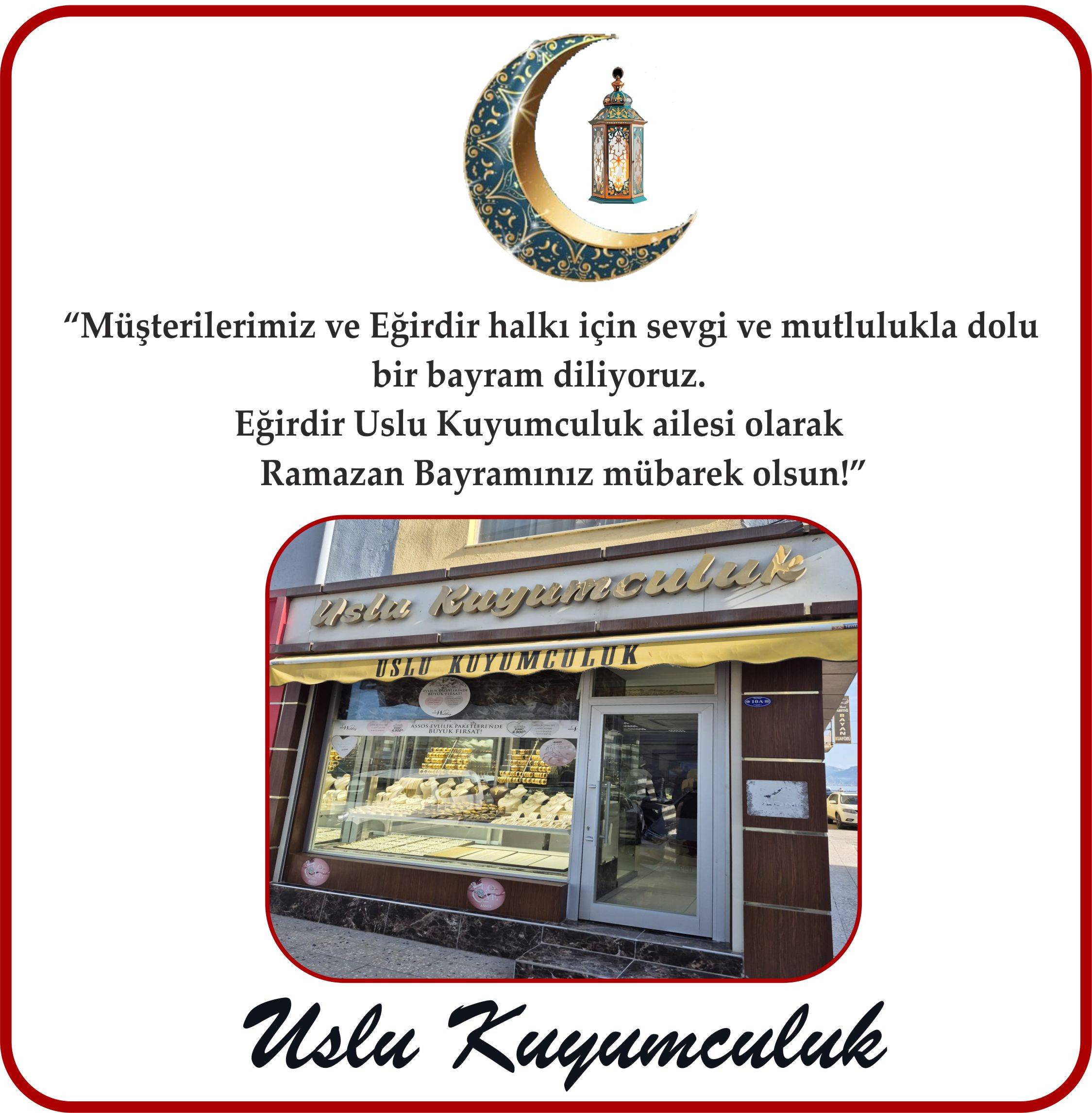 Eğirdir’in köklü işletmelerinden Uslu Kuyumculuk, Ramazan Bayramı dolayısıyla müşterilerine ve tüm Eğirdir halkına içten mesaj gönderdi. İşletme yetkilileri, birlik, beraberlik ve paylaşmanın önemine vurgu yaparak, tüm İslam aleminin bayramını kutladı.