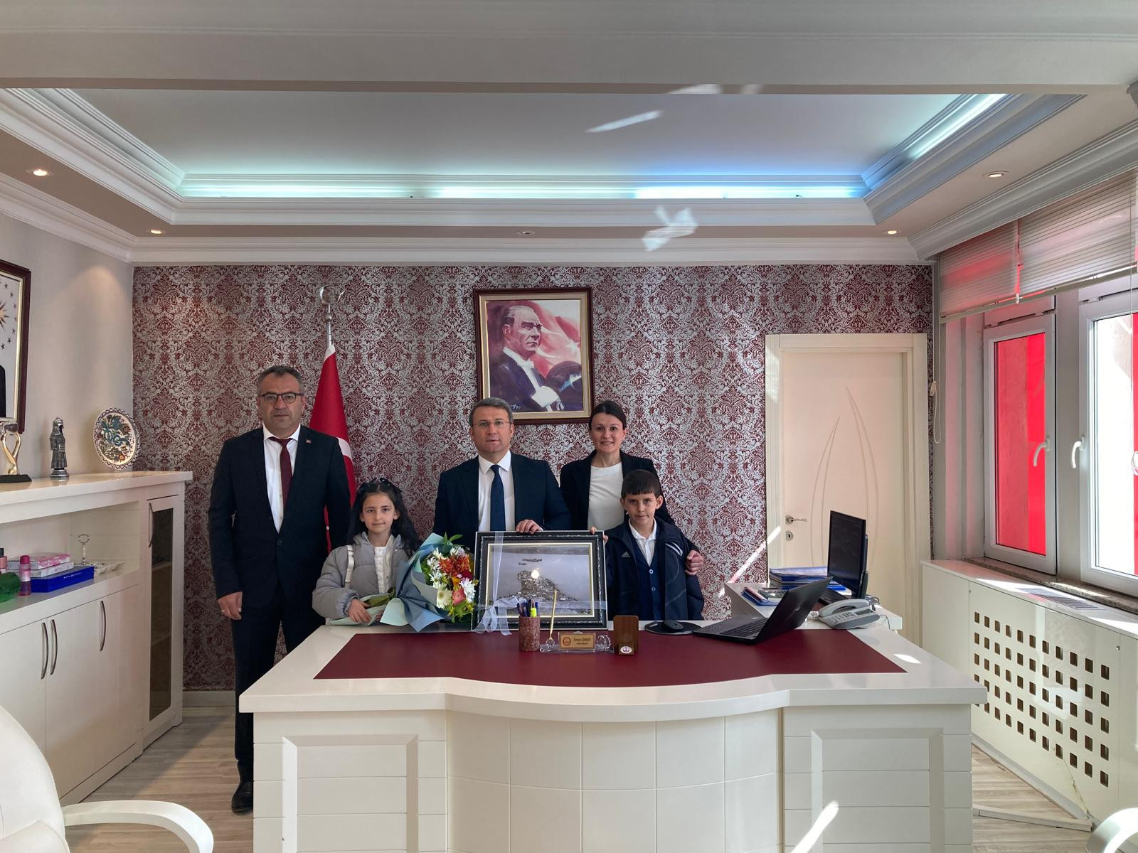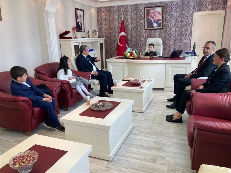 23 Nisan Ulusal Egemenlik ve Çocuk Bayramı etkinlikleri kapsamında Akademi Kreş Öğrencisi Ahmet Ayaz Özdoğan, Muzaffer Yaşar Şapçı İlkokulu 3/B sınıfı öğrencisi Gökçe Okutan, 3/A sınıfı öğrencisi Selim Uzun, Okul Müdürü Ercan Öcal ve Sınıf Öğretmeni Selma Demirel, Kaymakam Ömer Çimşit’i makamında ziyaret etti.